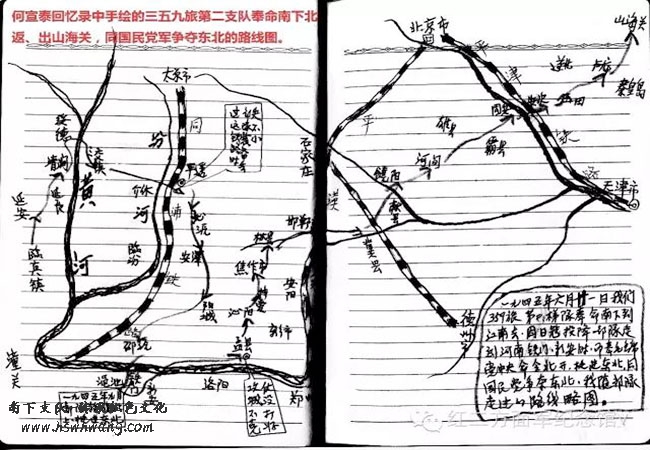 何宣泰回忆录中手绘的三五九旅第二支队奉命南下北返、出山海关,同国民党军争夺东北的路线图。